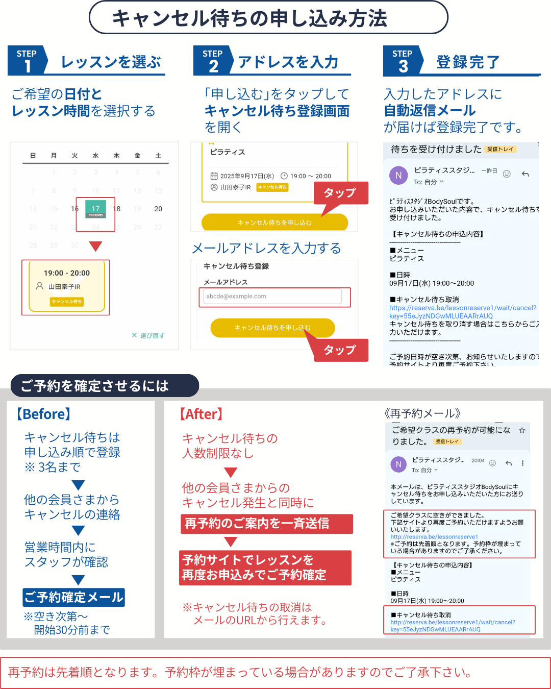 キャンセル待ち登録中は、キャンセル発生の都度、再予約メールが届きますので、お早めに再予約して頂けますようお願いいたします。
