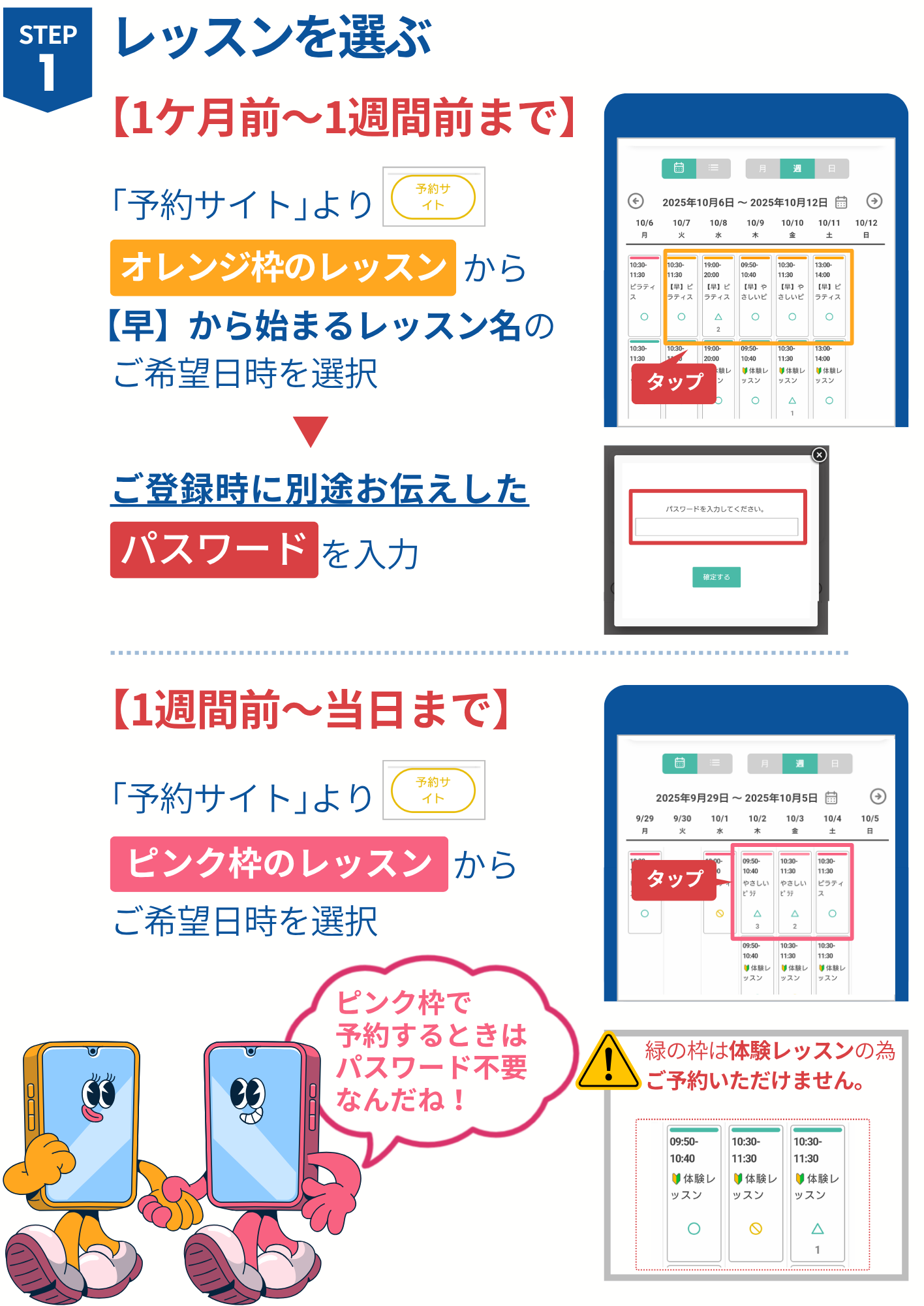 レッスン一週間前からは通常会員様からのご予約が集中して、ご予約に対応しかねる場合がございます。