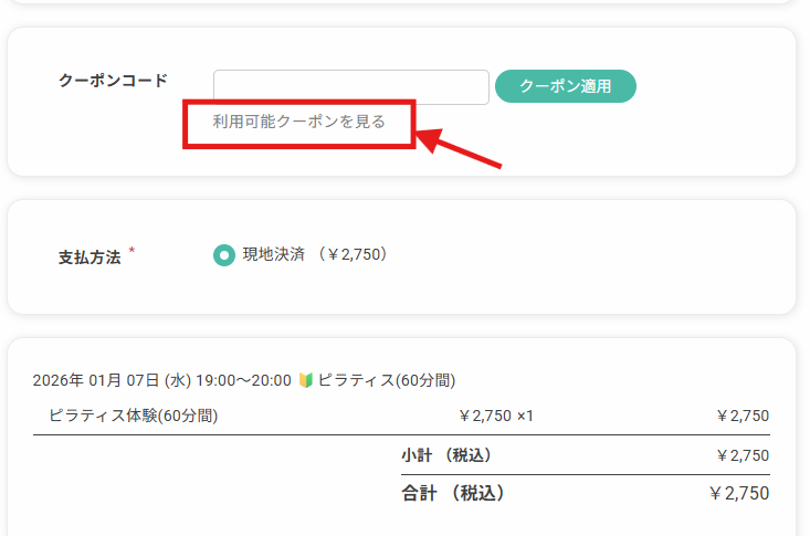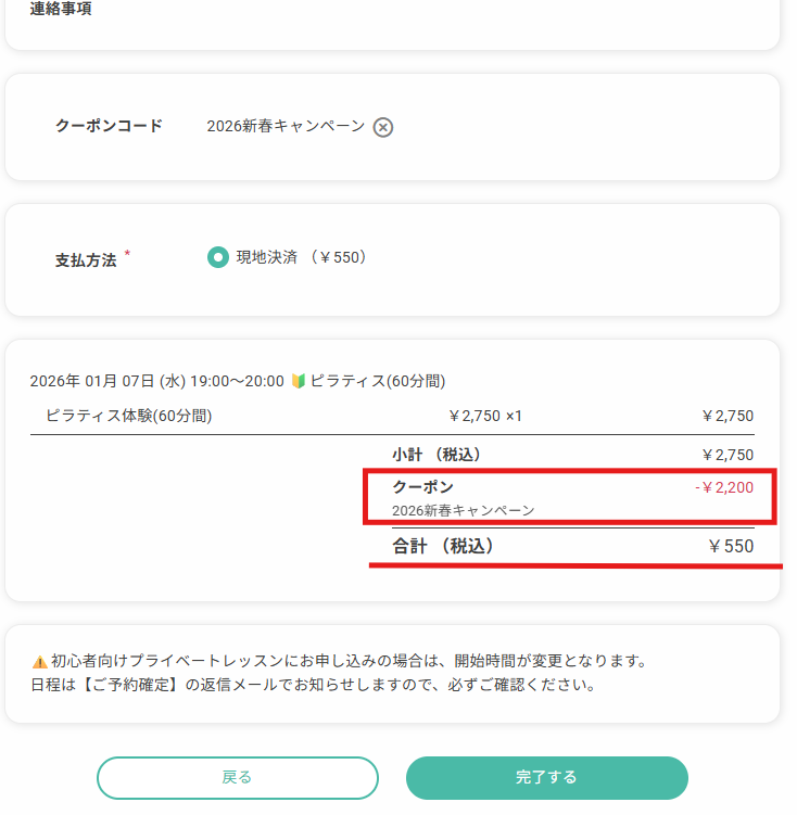 予約最終確認画面で割引クーポンを適用させます